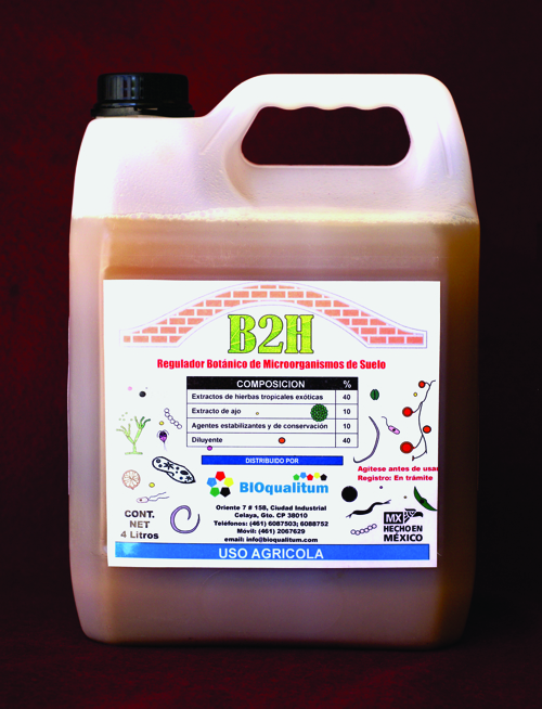 B2H es un producto orgánico formulado a partir de extractos provenientes de plantas que ayudan a disminuir las poblaciones microbianas y nematodos patógenos del suelo, facilitando la colonización posterior de la rizósfera con microorganismos benéficos. Este producto puede sustituir los productos químicos utilizados para esterilizar el suelo, como el metam sodio, y es compatible con fertilizantes y otros pesticidas de uso común.